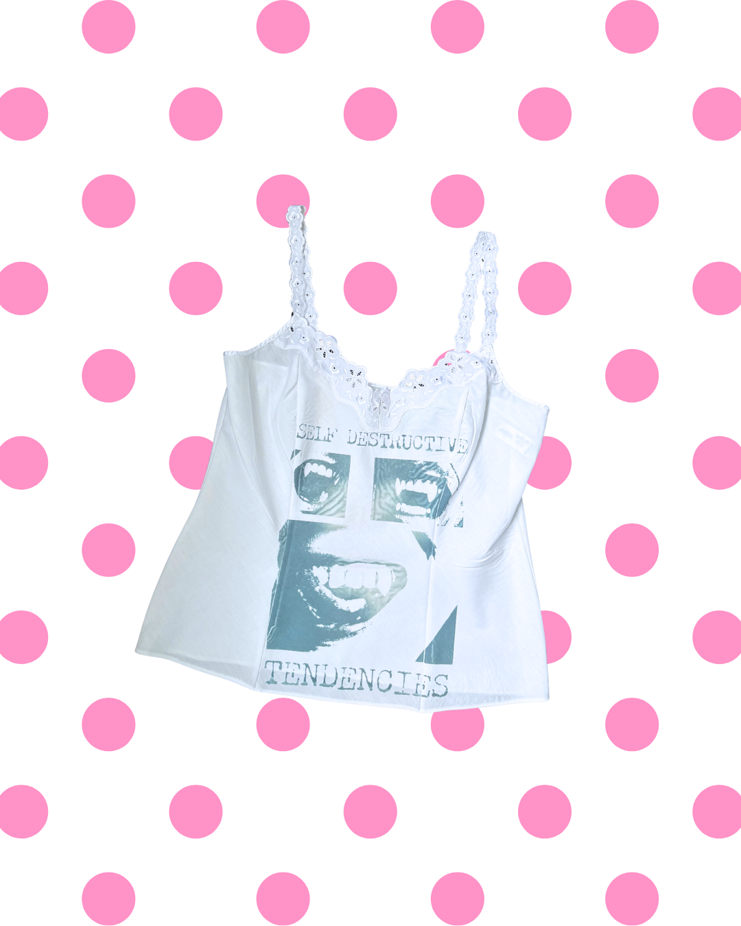 A one-of-a-kind reworked vintage cami top featuring our hand-printed self destructive tendencies artwork, printed by hand in Paisley, Scotland. Each piece is a reworked vintage or preloved garment which carries its own history, with signs of wear and tear that speak to its past life. Due to the handmade print process, small misprints or dye transfers may appear, we see these as part of the charm, adding individuality and character to every garment. No two pieces are ever the same, making this a truly unique piece of wearable art.